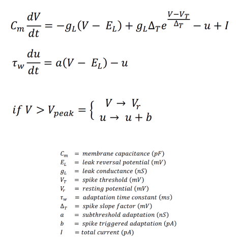 AdEx neuron model belongs to the same hybrid two-dimensional class of neuron models as Izhikevich' model (adaptive quadratic integrate and fire) and it is described with the following two differential equations and one reset condition:
